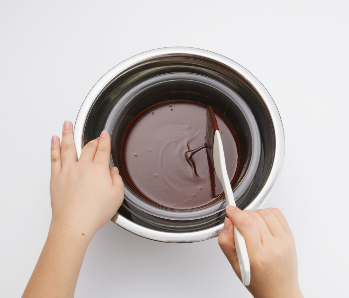 Beslag maken – Meng alle ingrediënten behalve de chocolade in een kom. Roer tot een glad beslag zonder klontjes.