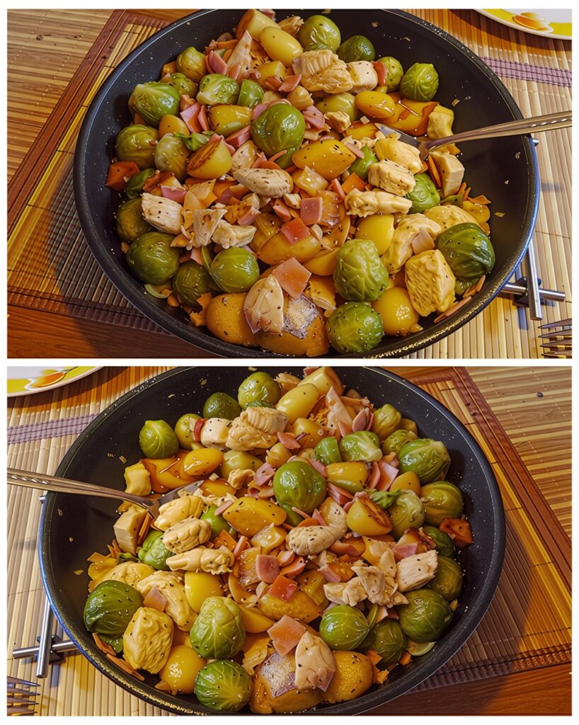 Boerenpan bomvol vitamines aardappel, spruitjes, kip en kalkoenham in 40 minuten op tafel
