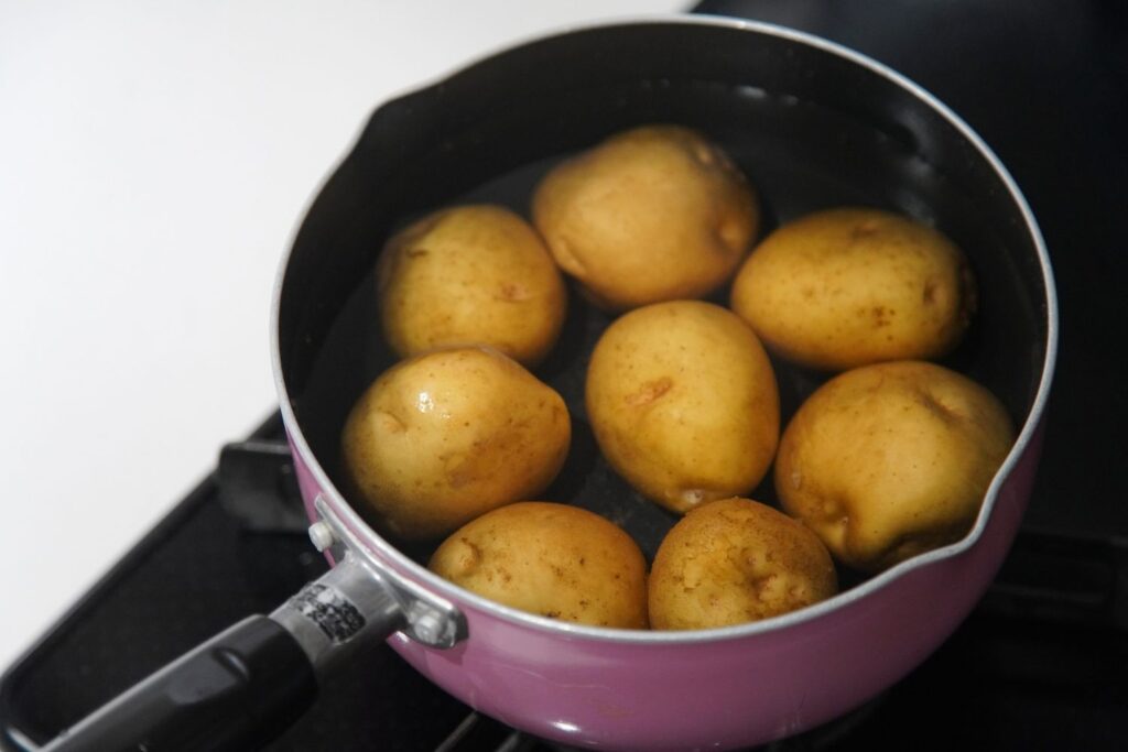 Begin met het schoonmaken van de aardappelen. Was ze goed en verwijder eventuele beschadigingen. Kook de aardappelen ongeveer 20 minuten in licht gezouten water totdat ze gaar zijn, maar nog wel stevig. Giet af, laat iets afkoelen en schil ze. Halveer de aardappelen eventueel als ze erg groot zijn, zodat ze straks gelijkmatig garen in de ovenschaal.Spruitjes voorbereiden