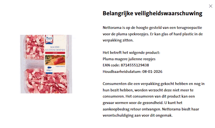 Vandaag is dat opnieuw het geval. Fabrikant Pluma heeft een landelijke waarschuwing doen uitgaan voor een populair product dat in veel huishoudens in de koelkast ligt: magere spekreepjes. Deze spekreepjes worden gebruikt voor pasta’s, stamppotten, roerbakgerechten en salades, en liggen bij meerdere ketens in het schap.