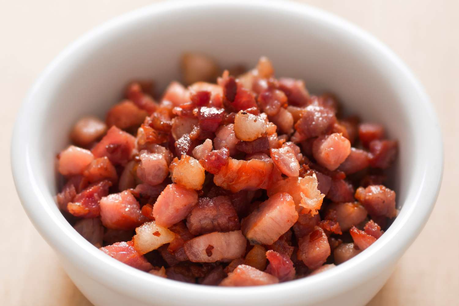 Gooi de spekreepjes niet in de pan, zelfs niet als het er goed uitziet. Stukjes glas of plastic kunnen klein en onzichtbaar zijn.