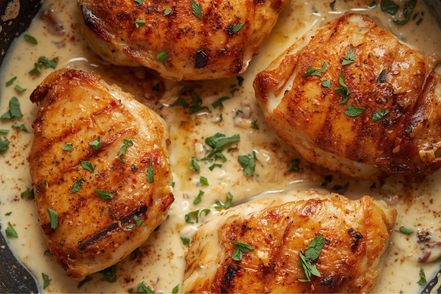 Leg de gegrilde kip op een groot bord of verdeel over borden en schep de romige knoflooksaus erover. Voor extra kleur en smaak kun je de kip garneren met wat extra fijngehakte peterselie of een paar plakjes lente-ui.