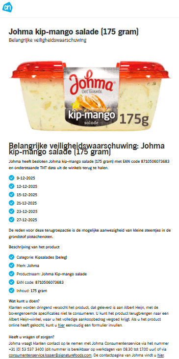 Johma heeft de Kip-Mango Salade (175 gram, EAN-code 8710506073683) met specifieke houdbaarheidsdatums teruggeroepen wegens mogelijke aanwezigheid van kleine steentjes in de salade. Deze terugroepactie geldt voor producten verkocht tussen 9 december 2025 en 27 december 2025 in vrijwel alle supermarktketens.
