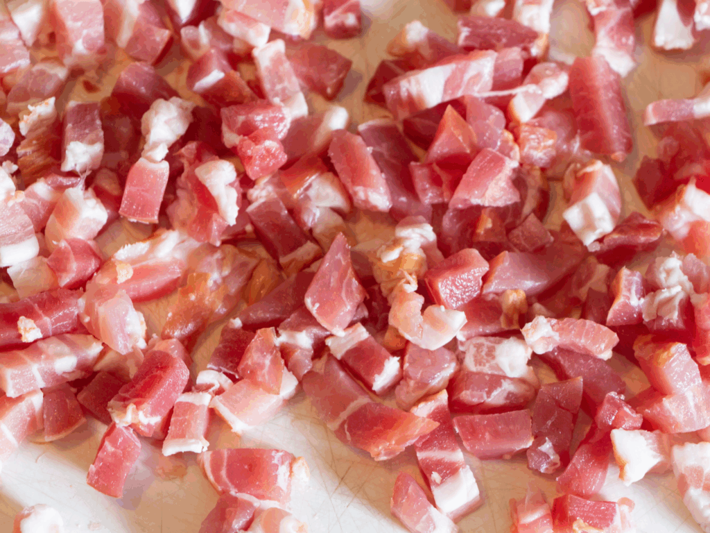 Verhit de boter samen met de olijfolie in een ruime pan. Voeg de spekblokjes toe en bak ze goudbruin en krokant. Haal het spek uit de pan en zet apart.