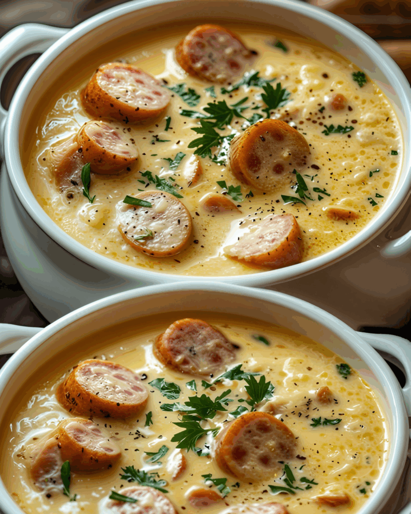 Voeg de room, de gebakken spekblokjes en de plakjes worst toe aan de soep. Laat nog 5 minuten zachtjes koken zodat alles goed warm is. Proef en breng eventueel verder op smaak.