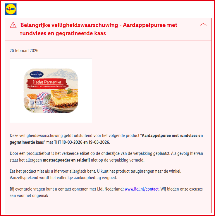 De allergenenwaarschuwing van Lidl betreft specifiek Hachis Parmentier – aardappelpuree met rundvlees en gegratineerde kaas met THT-datums 18-03-2026 en 19-03-2026.