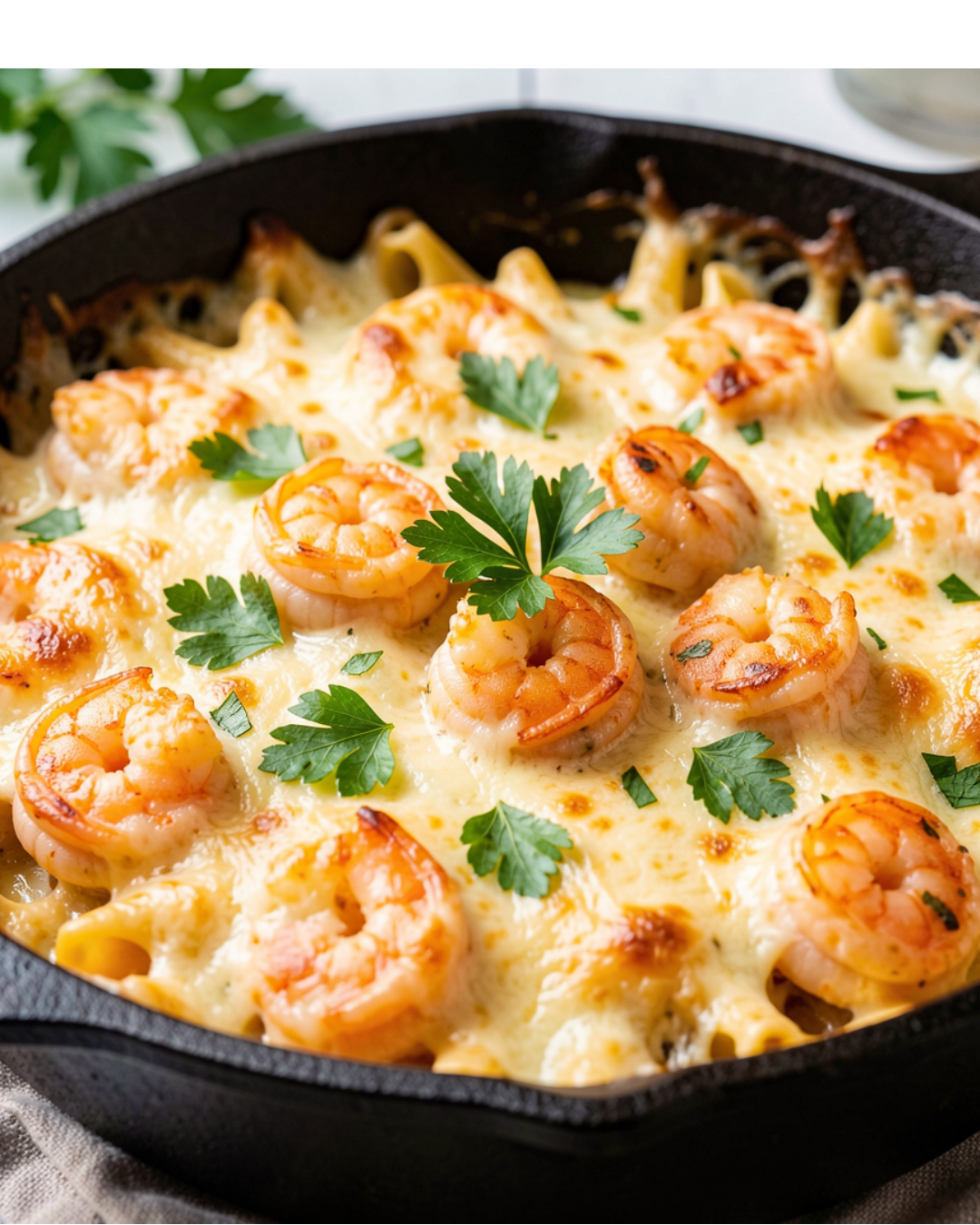 Op zoek naar een gerecht dat zowel troostrijk als een beetje luxe voelt? Deze romige garnalen pasta uit de oven combineert zachte, sappige garnalen met een fluweelzachte, knoflookrijke saus, gegarneerd met gesmolten kaas en verse kruiden. De pasta neemt al die romige smaken op, terwijl de garnalen zorgen voor een frisse, lichte zeevruchtensmaak. Perfect voor een doordeweekse avond, maar ook indrukwekkend genoeg voor een diner met vrienden of familie. En het mooiste: je staat er minder dan een uur in de keuken voor.