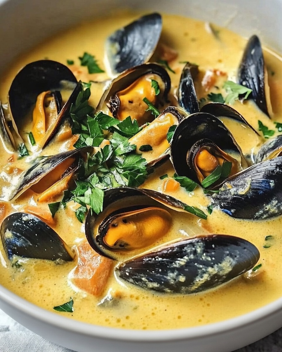 De kracht van dit recept zit in de eenvoud. Mosselen hebben van zichzelf een zilte, zachte smaak. Knoflook versterkt die smaak zonder te overheersen, terwijl zure room zorgt voor frisheid en romigheid tegelijk.