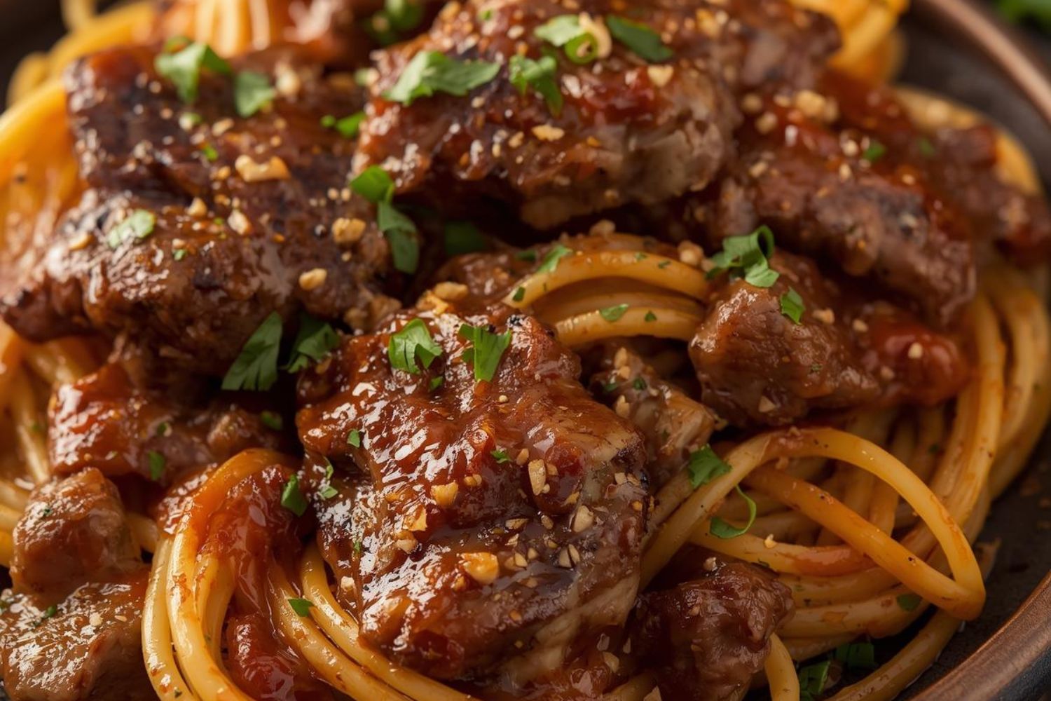Stel je voor: malse stukjes rundvlees met een mooi bruin korstje, omhuld door een glanzende zoet-pittige knoflooksaus, geserveerd op perfect gegaarde pasta. Elke hap combineert hartig vlees, romige boter, knoflook en een lichte pit die wordt afgerond door een subtiele zoetheid. Dit is geen gewone doordeweekse maaltijd, maar een gerecht dat voelt alsof je in een goed restaurant zit – gewoon aan je eigen keukentafel.